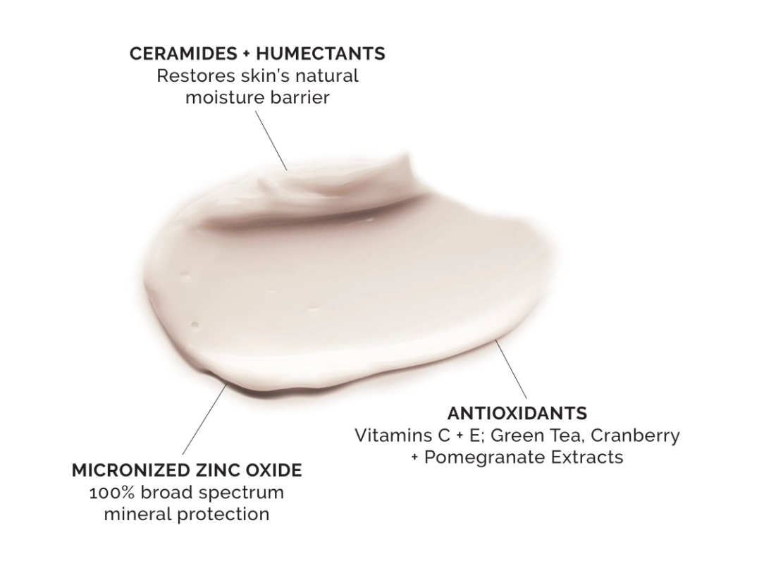 dimethicone, caprylic/capric triglyceride, dimethicone crosspolymer, dimethicone/vinyl dimethicone crosspolymer, butyloctyl salicylate, glyceryl isostearate, polyester-8, polysilicone-15, ceramide ap, ceramide eop, ceramide eos, ceramide np, ceramide ns, tetrahexyldecyl ascorbate (vitamin c), camelia sinensis leaf extract (green tea), punica granatum extract (pomegranate), vaccinum macrocarpon (cranberry) fruit extract, tocopheryl acetate (vitamin e), ascorbyl palmitate (vitamin c), tocopherol (vitamin e), glycerin, water (aqua), behenic acid, cholesterol, polyhydroxystearic acid, silica, ceteareth-25, cetyl alcohol, peg/ppg-18/18 dimethicone, caprooyl phytosphingosine, caprooyl sphingosine, triethoxycaprylysilane, iron oxides (ci 77492, ci 77491, ci 77499), titanium dioxide 2%, zinc oxide 17%